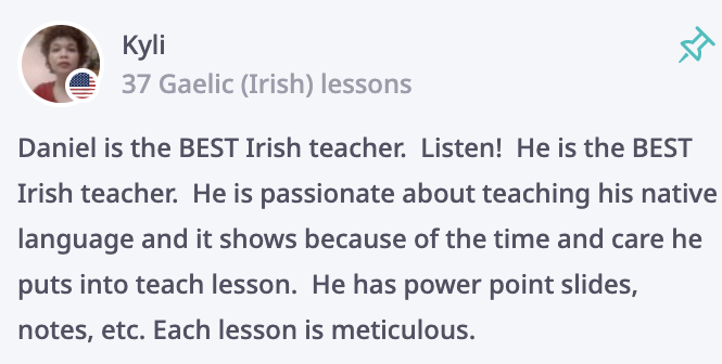 I'm a qualified Irish teacher with over 4 years experience and have taught over 2,500 clases to students of all levels from 20+ different countries, so needless to say, I like to think that I know my stuff! ๐Ÿค“